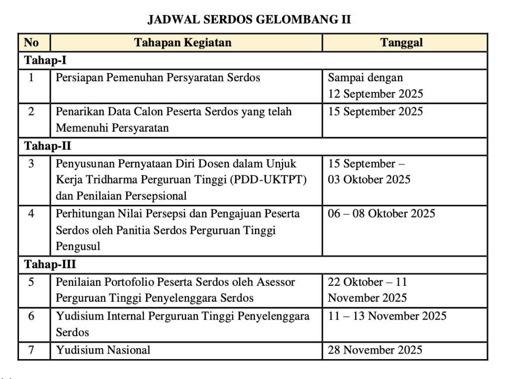 Sertifikasi Dosen (SERDOS 2025) merupakan salah satu langkah penting dalam meningkatkan kualitas dan profesionalisme dosen di Indonesia. Program ini menjadi pintu masuk menuju pengakuan kompetensi dalam melaksanakan Tridharma Perguruan Tinggi. Bagi Anda yang terdaftar sebagai peserta SERDOS Gelombang 2 Tahun 2025, simak jadwal lengkap dan tahapan penting berikut agar tidak terlewat satu pun prosesnya!